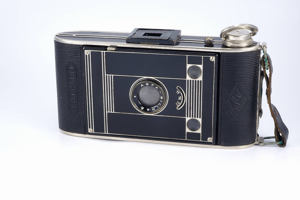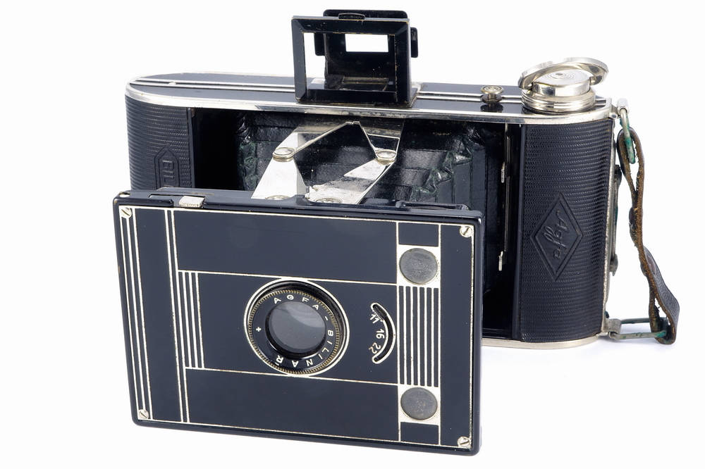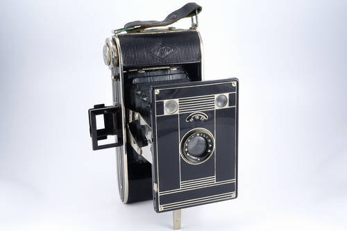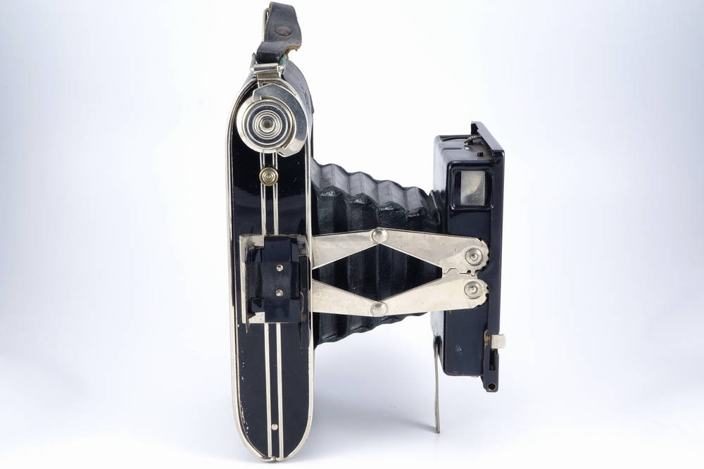 | Details | Spreizen-Faltkamera Gestreifte Objektivplatte Name vorne unten Sucherrahmen für vertikal Brilliantsucher für vertikal und horizontal Drahtauslöserbuchse |