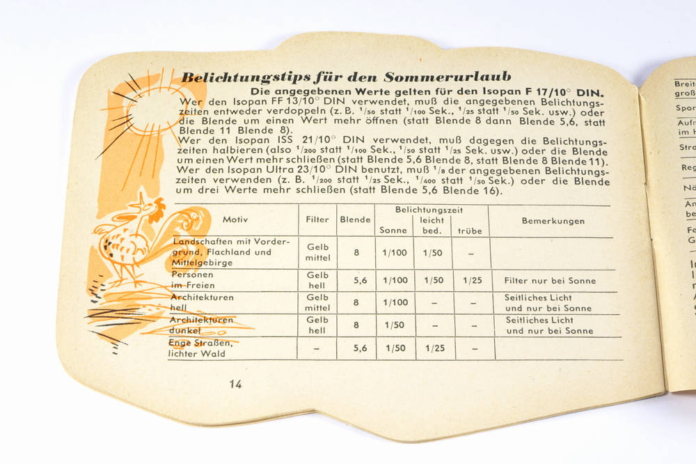 | Details | Inhalt: Belichtungstabelle Allgemeine Aufnahmetips Phototips Artikelwerbung |