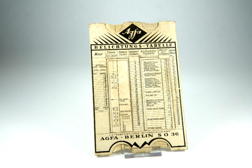 | Details | - Ausführung: eckig - Material: Pappe, unbeschichtet - Agfa-Raute (ab 1926) - Seitliches Streifenmuster - 150 x 102mm - Tabelle für 50° nördlicher Breite - Für Platten und Filme |